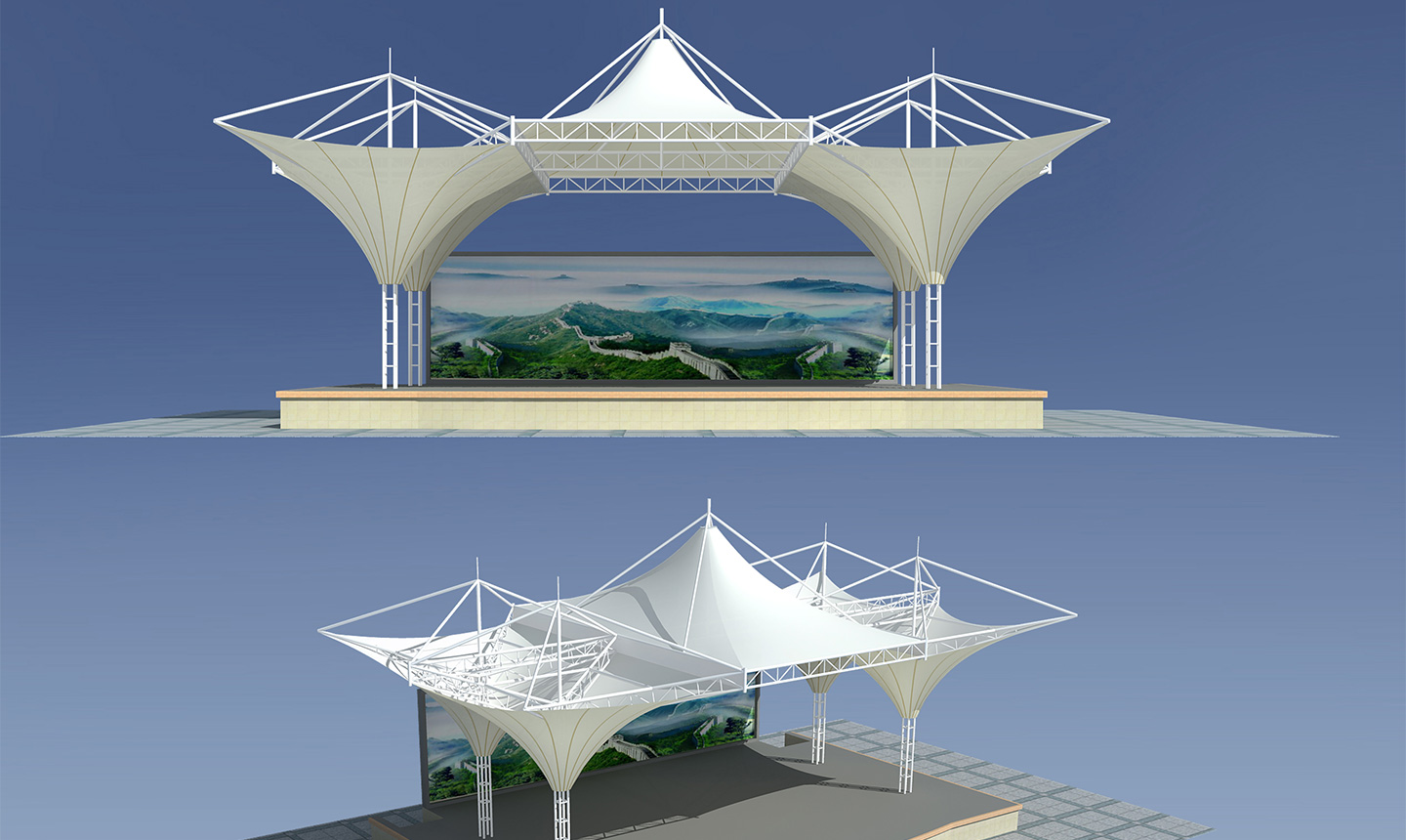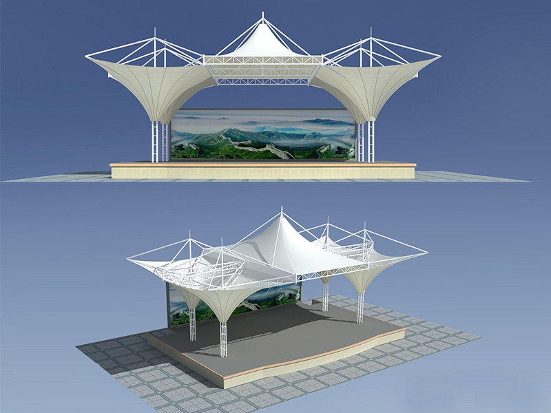 1、舞臺(tái)張拉膜結(jié)構(gòu)的共同曲面外形使其具有激烈的雕塑感,膜面經(jīng)過(guò)張力到達(dá)自平衡。