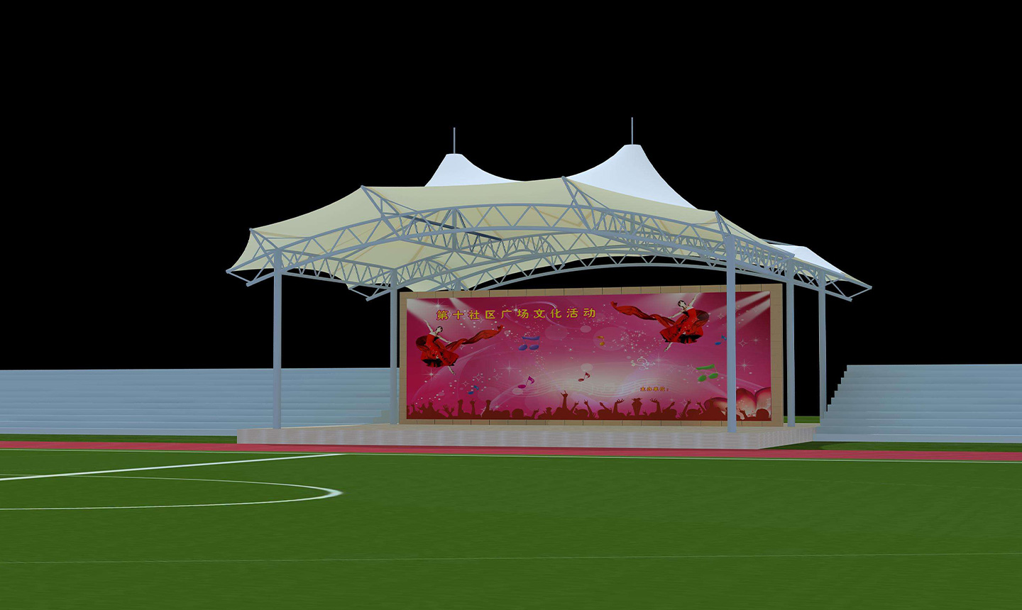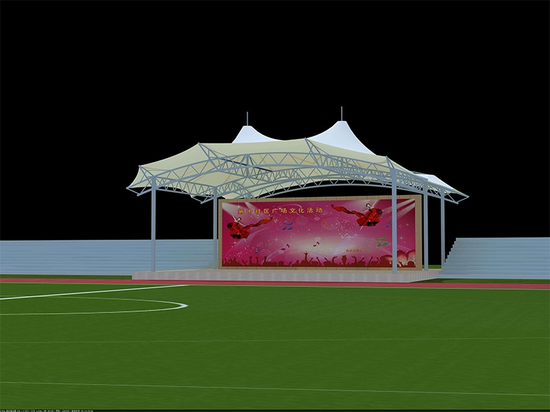 1、舞臺張拉膜結(jié)構(gòu)的共同曲面外形使其具有激烈的雕塑感,膜面經(jīng)過張力到達(dá)自平衡。
