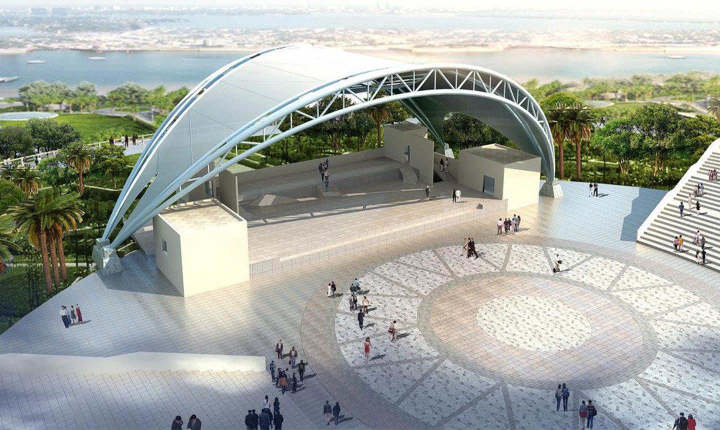 1、舞臺(tái)張拉膜結(jié)構(gòu)的共同曲面外形使其具有激烈的雕塑感,膜面經(jīng)過(guò)張力到達(dá)自平衡。