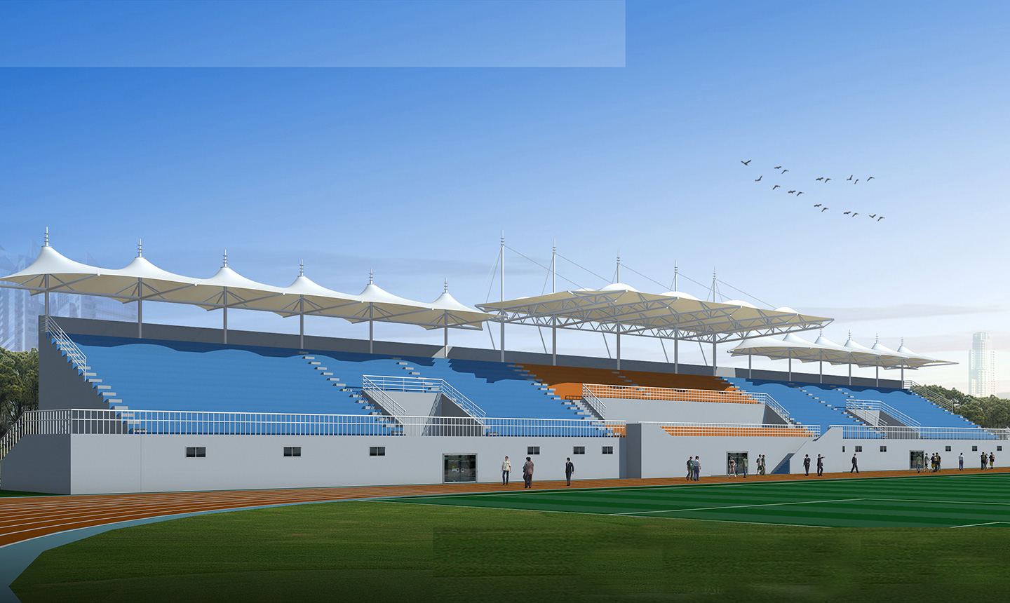 2、體育膜結(jié)構(gòu)看臺(tái)的外觀設(shè)計(jì)一向都是露天的,所以在設(shè)計(jì)的時(shí)候我們需要注意它的承重力,因?yàn)橐话愣际菃蝹?cè)建造或者環(huán)繞建造,必須有無(wú)數(shù)個(gè)支撐點(diǎn)才能讓整個(gè)頂子具有強(qiáng)抗風(fēng)、抗震的功能 體育場(chǎng)看臺(tái)一般都是高大上的感覺,外觀別具特色,實(shí)用性也不錯(cuò)。同時(shí)這種看臺(tái)在夏季比賽的時(shí)候,觀眾特別希望可以坐在遮陽(yáng)效果好的一面,那么我們就需要把這些因素考慮進(jìn)去。盡量讓設(shè)計(jì)大面積的有遮陽(yáng)效果,最后在膜結(jié)構(gòu)裁剪的時(shí)候要量好尺寸,這樣每塊材料才能很好的焊接成功。做到這些,一個(gè)完美又實(shí)用的體育場(chǎng)看臺(tái)就會(huì)很快展現(xiàn)在眼前了。