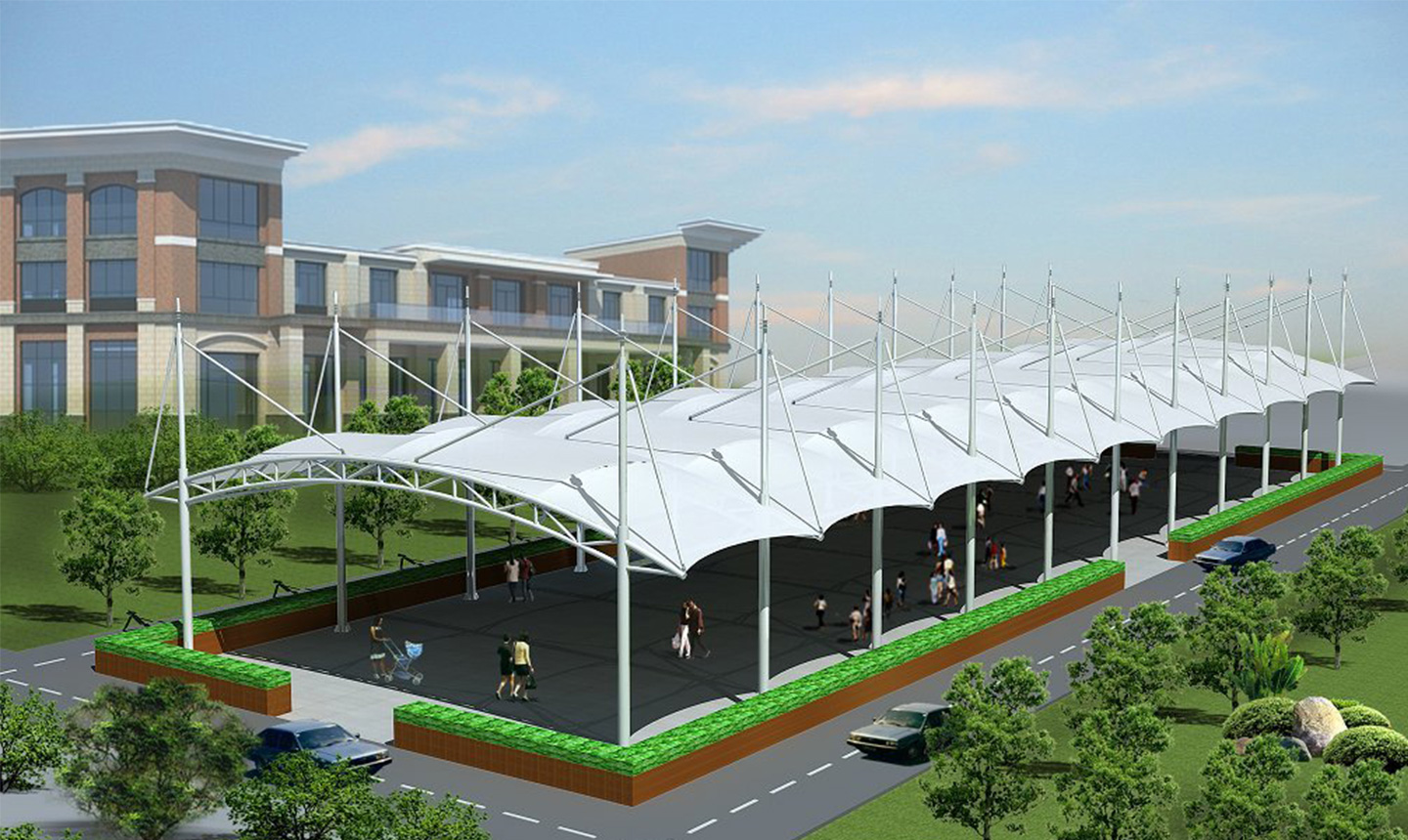 三、膜結(jié)構(gòu)的主體是鋼結(jié)構(gòu)、鋼結(jié)構(gòu)基本材料都可以在工廠完工,直接拉到現(xiàn)場安裝,節(jié)省在現(xiàn)場的時間。