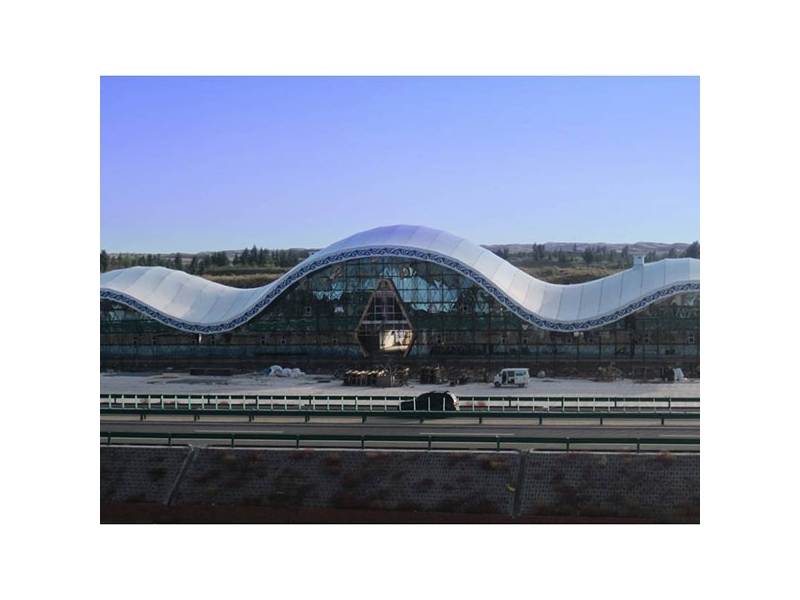 PTFE膜材的最大特點(diǎn)是強(qiáng)度高、耐久性好、防火難燃、自潔性好,不受紫外線影響,使用壽命在25年以上。具有高透光率,透光率為13%, 對(duì)熱能反射率73%,熱吸收量很少。正是因?yàn)檫@種劃時(shí)代的膜材料的發(fā)明,使膜結(jié)構(gòu)建筑成為現(xiàn)代化的永久性建筑。
